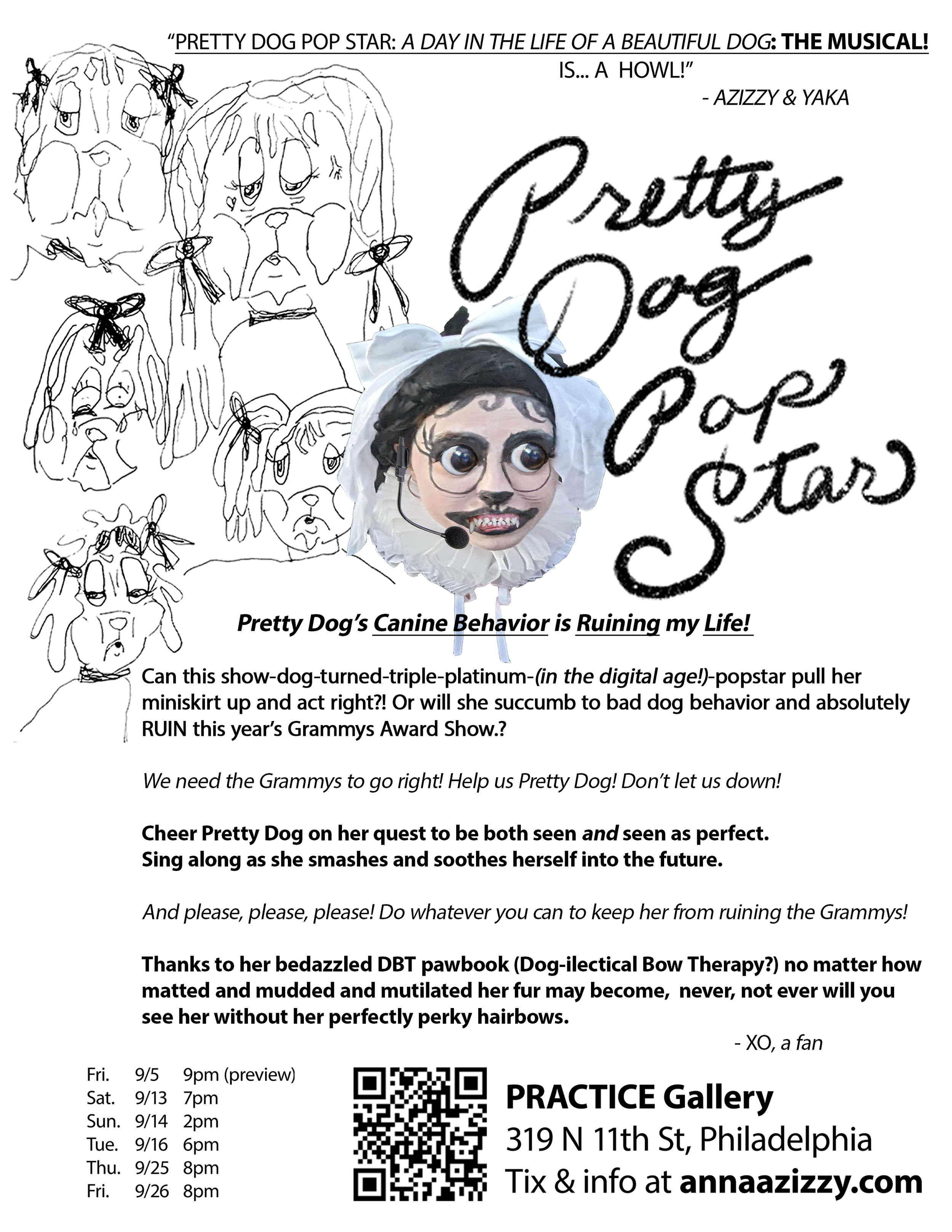 This is Azizzy’s second time in Phily for fringe, the first time being in 2023 with “The Secret Life of Gym Girls” Azizzy's latest show, “Pretty Dog Pop Star: A Day in the Life of a Beautiful Dog: THE MUSICAL” will have a run at PRACTICE Gallery in Philadelphia during the month of September. More info at www.annaazizzy.com